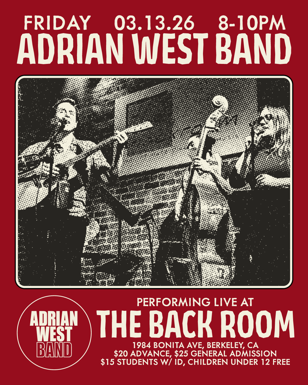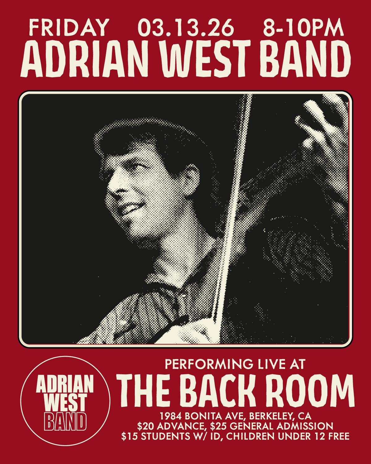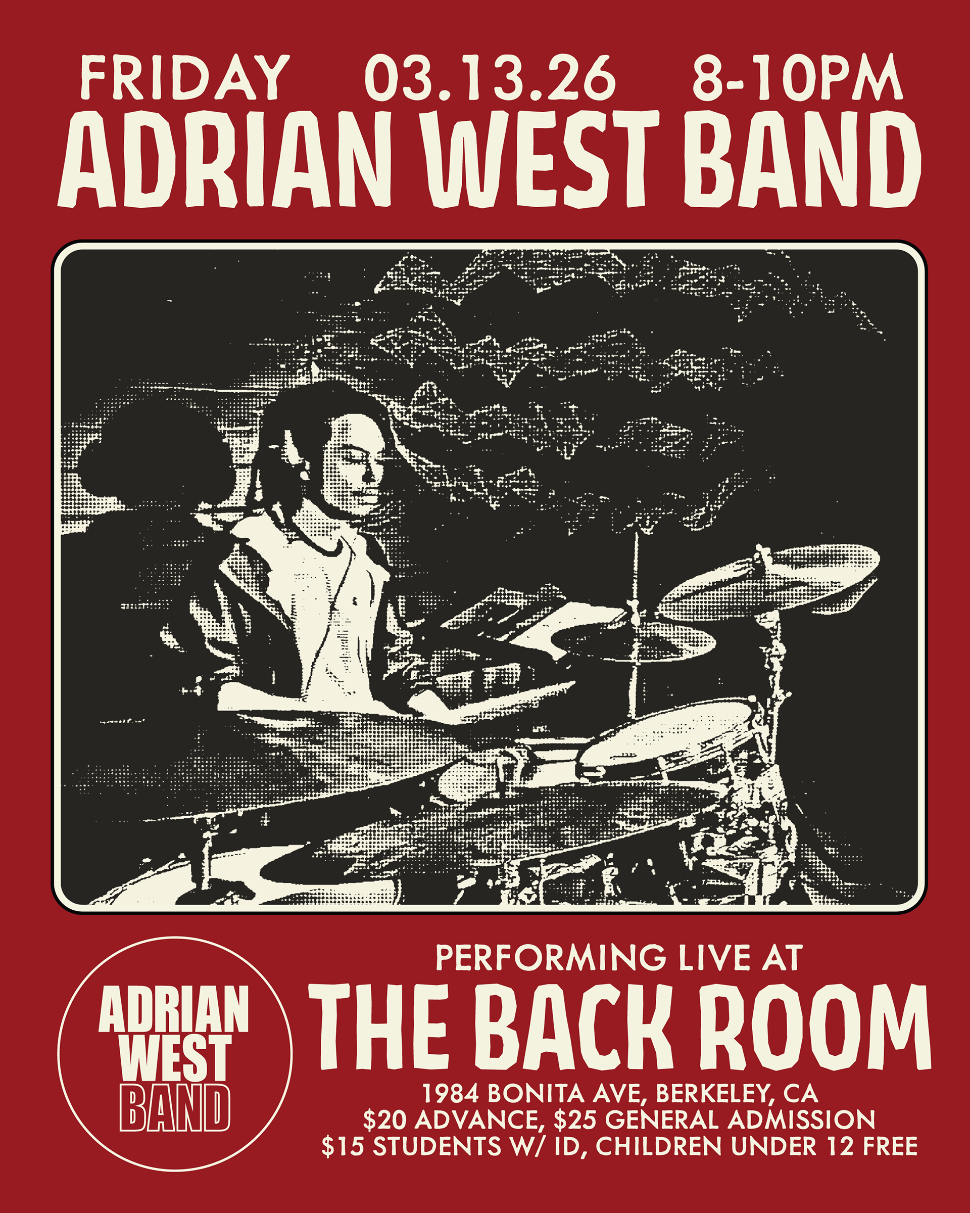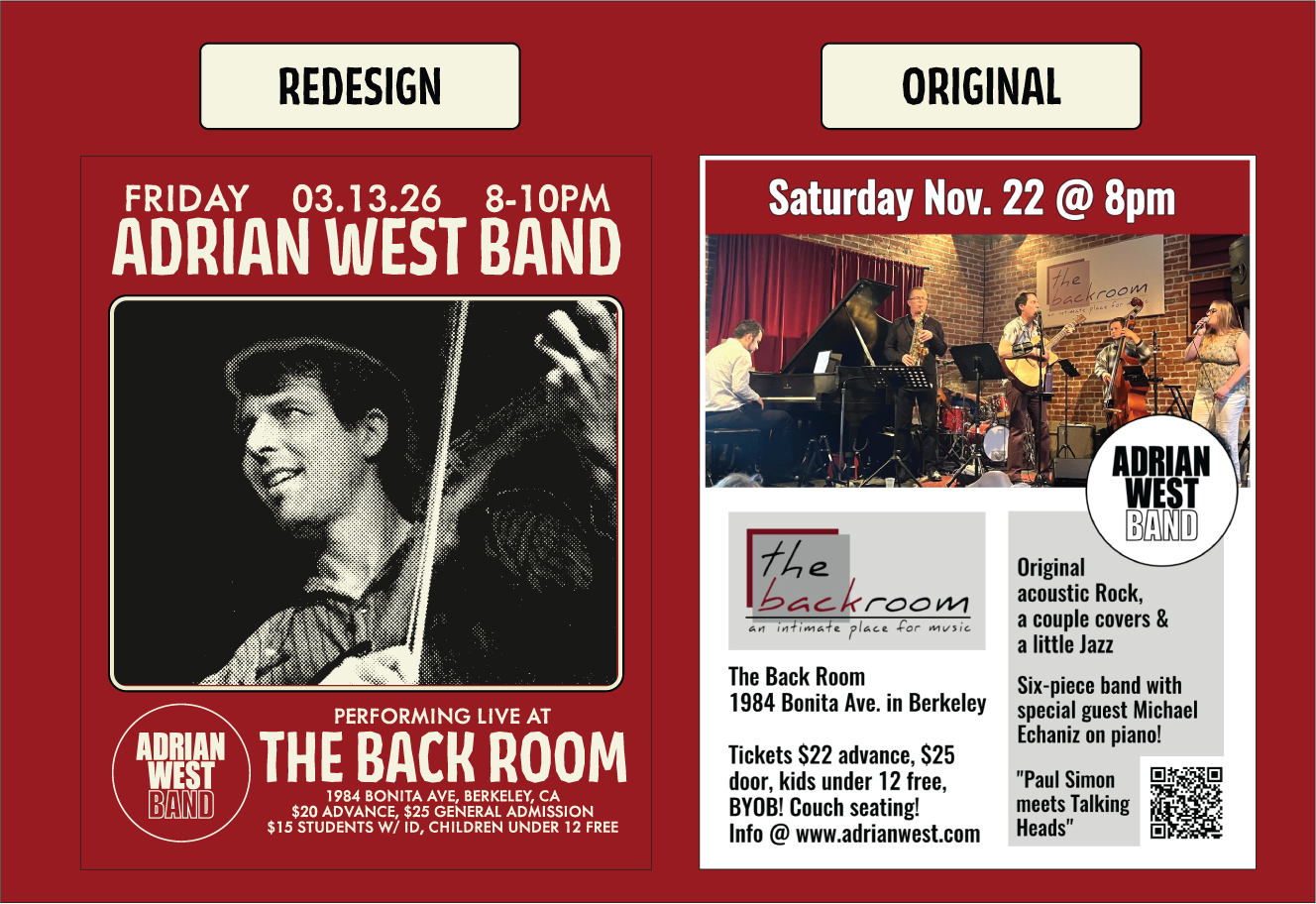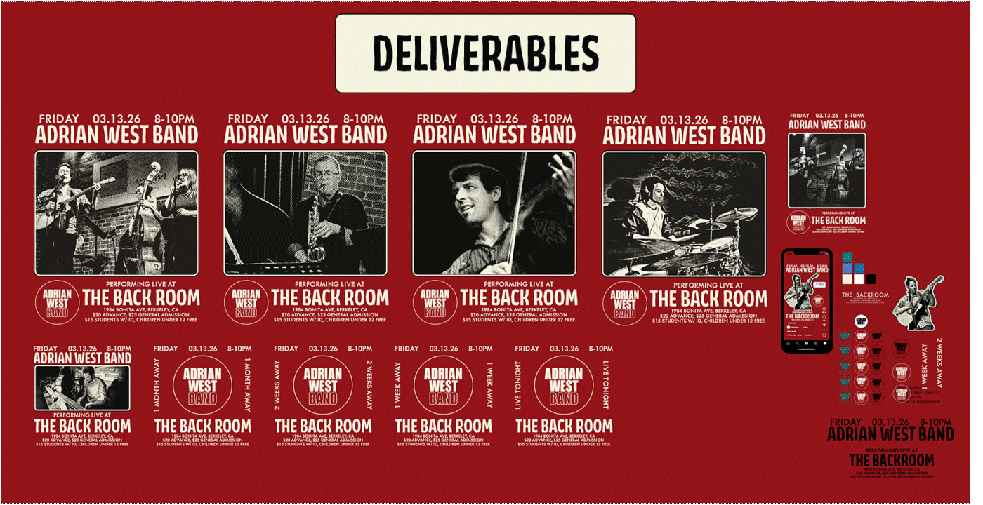 Designed a comprehensive event suite for the Oakland-based acoustic rock ensemble, Adrian West Band. Drawing inspiration from the band’s eclectic "Paul Simon meets Talking Heads" sound, I utilized a high-contrast halftone effect to unify provided photography with a modern, art-rock aesthetic. i wanted it to feel clean but with the classic grit of a zine. Deliverables included: 8x10 Print Posters Square Instagram Grid Posts Instagram Stories